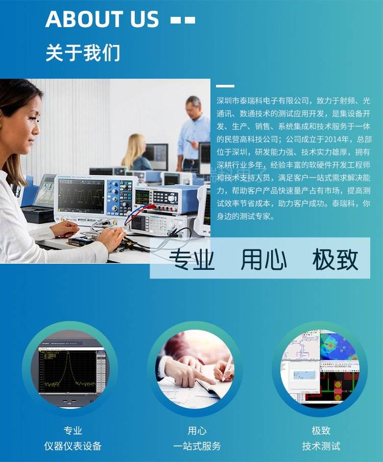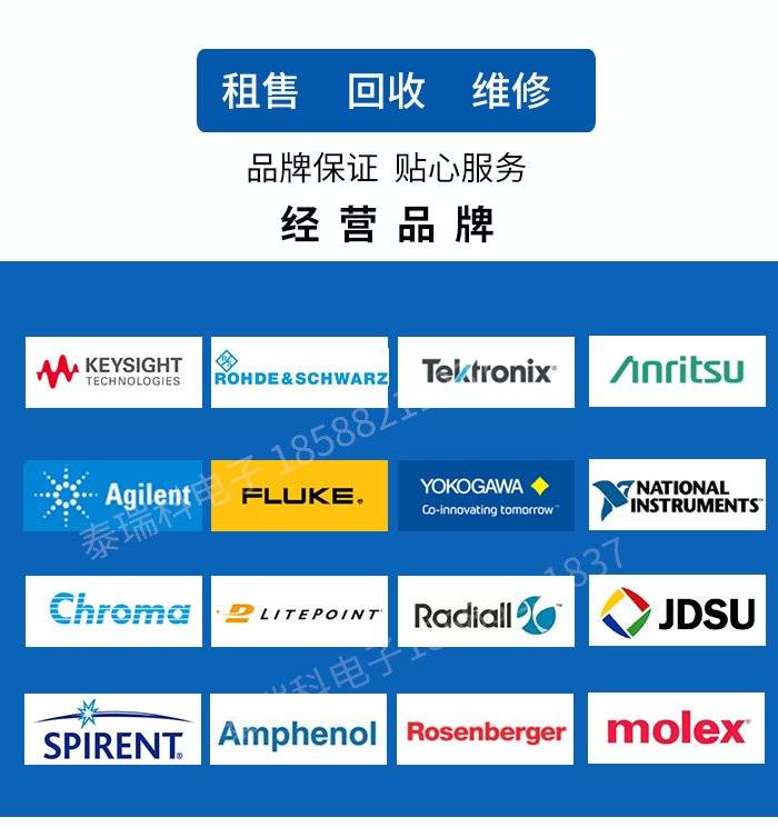 Keysight(是德科技)、Agilent(安捷伦)、罗德与施瓦茨(R&S)、ANRITSU(安立)、Litepoint(来特波特)、NI、Tektronix、Audio precision等海外知名品牌仪器仪表,其中包括:综合测试仪、频谱分析仪、WIFI综合测试仪、蓝牙综合测试仪、网络分析仪、信号发生器、示波器、音频分析仪等高端电子仪器的销售、租赁、维修、保养、校准、等项目,是综合技术服务型公司。